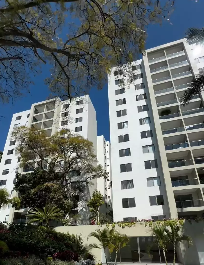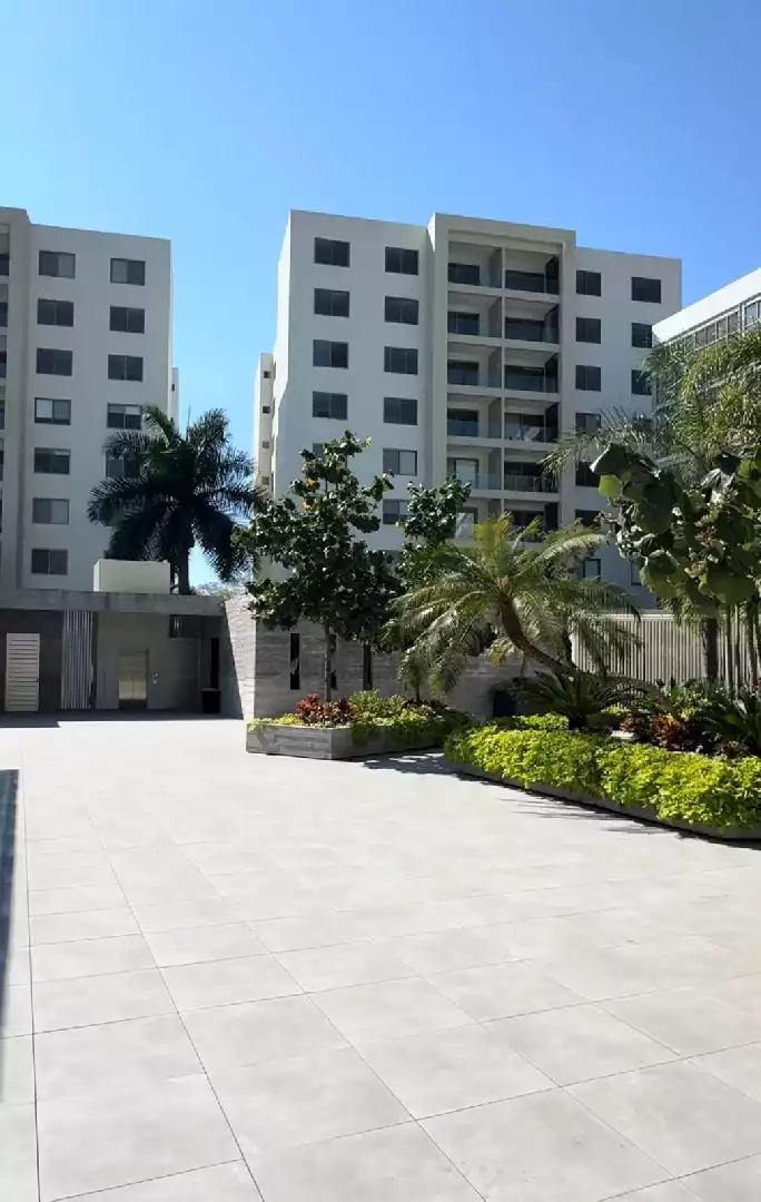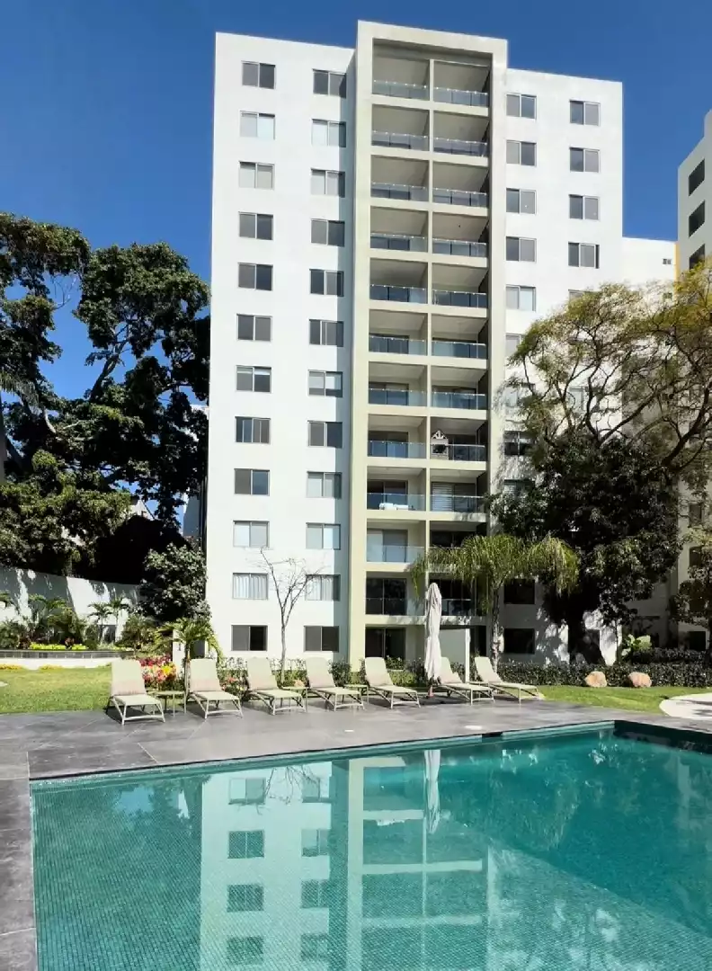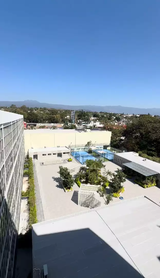 Departamento que tiene 2 recámaras, 2 baños, sala, comedor,patio de servicio,cocina equipada, 2 estacionamientos techados, elevador, amenidades para compartir: 2 canchas de padel, oficinas y salas de juntas, salon de usos múltiples, 2 salones de fiestas para eventos, terrazas, area con asadores, bodega, alberca y jacuzzi, Gimnasio, sala de cine, cafeteria,ludoteka, jardines, juegos infantiles y vigilancia. El mantenimiento está incluido y pueden usar al mes $350 para consumo en la cafetería .